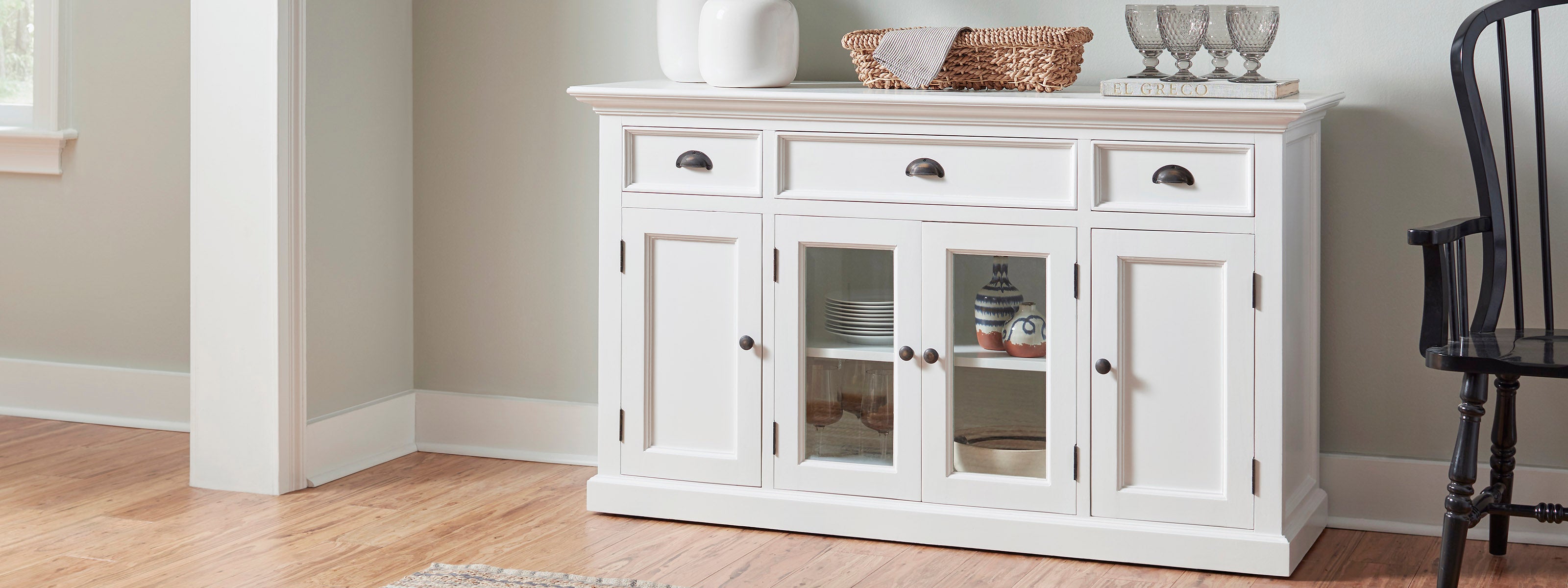 The generous proportions and farmhouse charm of this piece render it suitable for the kitchen and living space. Crown moulding and shaker style doors offer subtle styling. Utensils or linens can easily be housed in the drawers while fixed shelving behind the five doors provide ample storage.